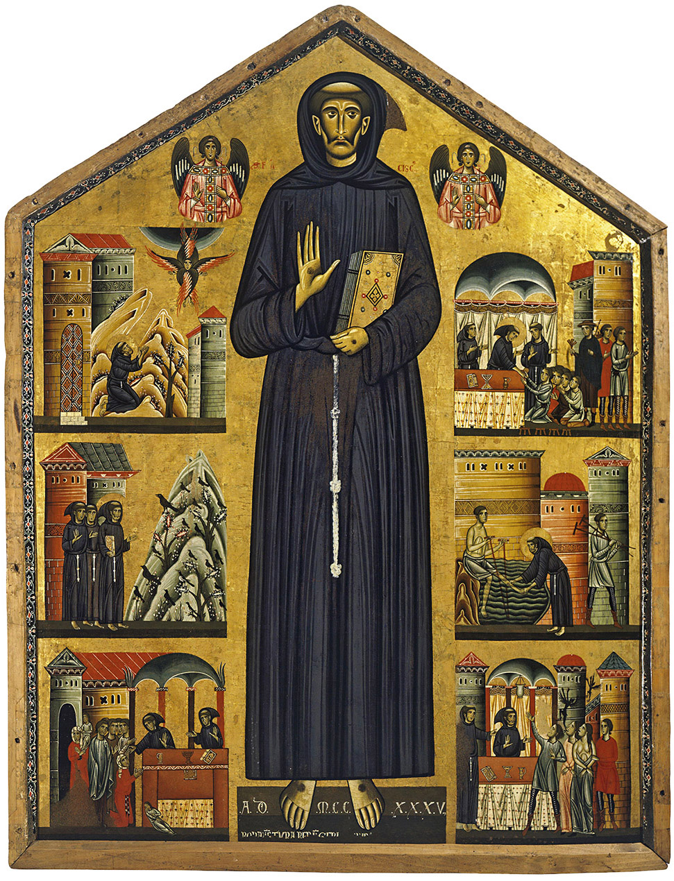 La cronología nos indica que la pintura fue realizada tan solo nueve años después de la muerte del Santo, convirtiéndose en modelo para los maestros posteriores. Francisco se presenta en el centro de la tabla, jerarquizado en sus proporciones y con los atributos iconográficos claves para su identificación: la tonsura, los estigmas en las manos y en los pies, el libro y el hábito con cíngulo de triple nudo. En su figura advertimos un lenguaje artístico arcaizante, arraigado en los principios bizantinos de frontalidad, hieratismo y bidimensionalidad, más propio de los iconos que de la humanización del gótico. A ambos lados, la recreación de los ángeles acentúa la solemnidad y santidad del protagonista. En la composición general de la tabla, san Francisco constituye el eje de simetría para ordenar los episodios que conforman esta hagiografía pintada.