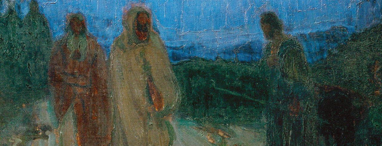 Con su Cristo y sus discípulos, pintado en 1905, Henry Tanner evolucionó del realismo al impresionismo contemporáneo, sin dejar de inspirarse en el simbolismo encarnado por Maurice Denis. El artista nos transmite, ante todo, su «impresión» a través de una versión tenue del famoso «azul Tanner» basado en una paleta de índigo y turquesa. Esta sutil paleta recrea una atmósfera ya crepuscular, teñida de una esperanza vibrante[1]. El pequeño sol que cuelga sobre Jesús no tiene nada que ver con un sol de poniente. Con su luz blanca, ilumina el azul de medianoche del cuadro, como si el Resucitado hubiera dejado a los suyos, que están en el mundo, el halo de su cuerpo glorioso hasta que regrese. «Que su luz reavive la llama de nuestra fe en la resurrección» es el mensaje que nos envía el artista. Y, dejando que Jesús y el paisaje aparezcan en color verde bajo la oscuridad de la tarde que cae, da testimonio de que esta fe es el fundamento de la esperanza cristiana y da sentido a la historia, a menudo oscura, por la que camina nuestra existencia terrena.